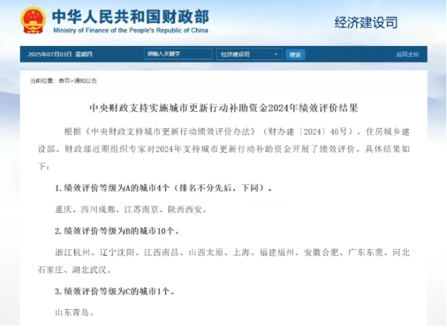 2024年城市更新行动补助资金绩效评价结果公布:A级城市4个(重庆、成都、南京、西安),B级10个(杭州、沈阳等),C级1个(青岛)。要求相关城市改进工作,加快项目建设和资金管理。