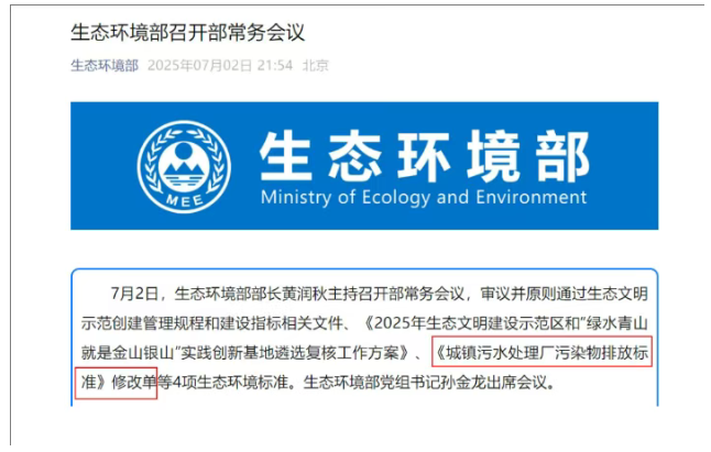 征求意见3年后,城镇污水处理厂污染物排放新标准终于要发布了。7月2日,生态环境部部长黄润秋主持召开部常务会议,审议并原则通过《城镇污水处理厂污染物排放标准》修改单(下称“修改单”)等4项生态环境标准。