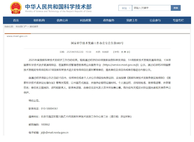 9月22日,中华人民共和国科学技术部官网发布《国家科学技术奖励工作办公室公告第103号》。