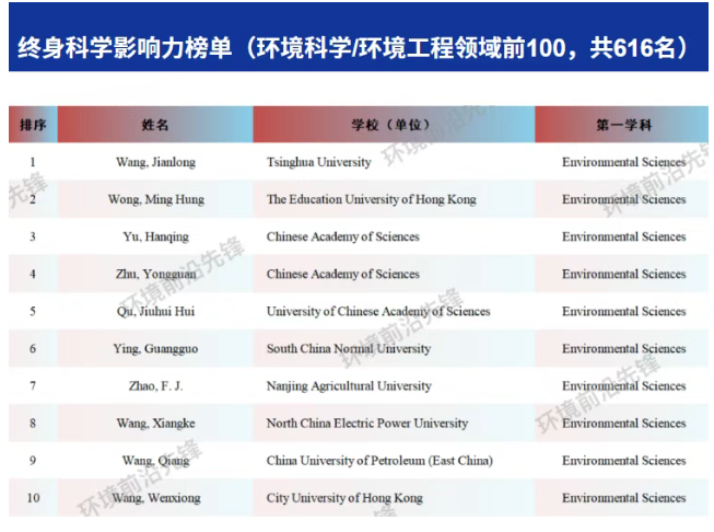 2025年全球前2%顶尖科学家榜单发布,环境科学/环境工程领域616名中国学者(含港澳台)入选“终身科学影响力榜单”
