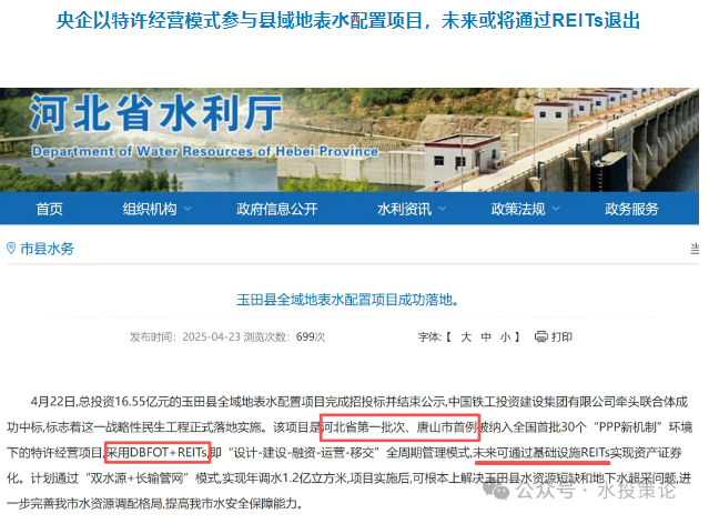 央企以特许经营模式参与县域地表水配置项目,未来或将通过REITs退出
