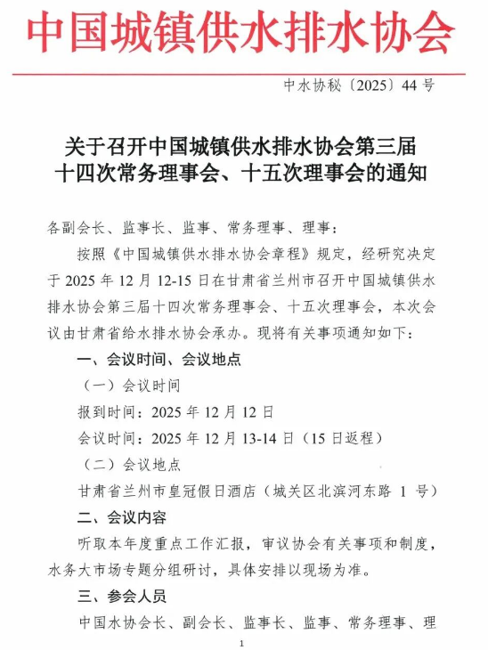 关于召开中国城镇供水排水协会第三届十四次常务理事会、十五次理事会的通知