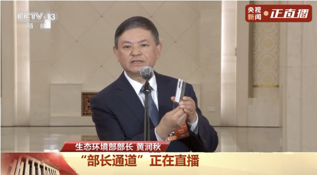 在今天举行的十四届全国人大四次会议第三场“部长通道”上,生态环境部部长黄润秋接受记者采访。